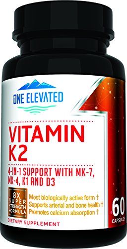 Vitamin K2 not only helps direct calcium to bind and deposit in the bone but also helps direct the calcium away from where it should not belong such as organs arteries and joint spaces. Vitamin K2 helps this process by activating the production thereby increasing the level of matrix GLA protein (MGP) produced by the smooth vascular muscles cells. This protein helps inhibit the accumulation of calcium in the walls of blood vessels. Without Vitamin K2 unwanted calcification in the arterial lining may occur. bA FULL SPECTRUM FORMULAb Provides 2 types of Vitamin K2 MK4 Menatetrenone 4 MK7 Menaquinone 7 Plus Vitamin K1 and Vitamin D3 for optimal results bSTRONGER BONESb Helps transport and direct Calcium from the bloodstream and store it in the bones and teeth bSUPPORT CARDIOVASCULAR HEALTHb Vitamin K2 keeps calcium out of your arterial lining preventing calcification of coronary arteries bMAXIMUM ABSORPTIONb With superior bioavailability of Menaquionone 7 combined with Vitamin D3 Vitamin K2 is absorbed and utilized most efficiently bHIGHEST QUALITYb To ensure purity and safety our products are manufactured in a fully GMP certified facility All Made in USAMore Info and Reviews Manufacturer: One Elevated; Model: ; MPN: VitaminK2001; Part Number: VitaminK2001; UPC: 641606360732; Color: ; Brand: One Elevated; Department: ; Size: ; Warranty: ; Label: One Elevated; Amazon Sale Rank: 50049;Buy On Amazon