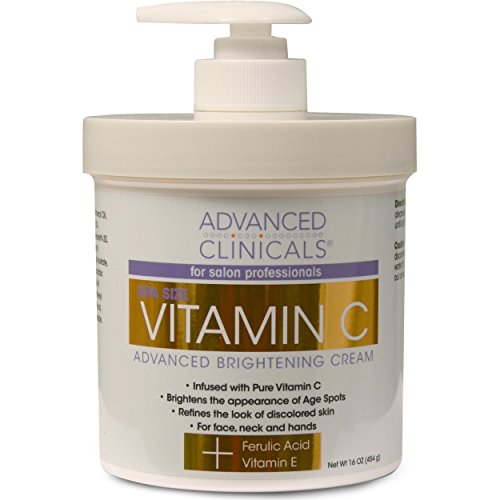 Bring back your youthful radiance with this newest spa size Vitamin C advanced brightening cream from Advanced Clinicals. This luxurious formula can be used on all skin types oily sensitive dry and will give you the gift of smoother skin and less age spots. Can be used under your eyes or any problem areas. Non prescription. Hydroquinone & paraben free. Spa size 16oz Vitamin C Brightening Day Cream for Salon Professionals Infused with pure Vitamin C Formulated with Ferulic Acid and Vitamin E and aloe vera for maximum hydrationAnti aging cream brightens the appearance of age spots 16oz of product will last you months Rich formula is thick enough to be a body moisturizer but gentle enough to be used as daily facial moisturizer Can be applied to neck and decollete hands faceRefines the look of discolored skin age spots freckles damage from sun spots hyperpigmentation acne scars Remove your age spotsQuick absorbing cream wont dry out your skin or leave sticky residue Great for all skin types dry sensitive skin Can be used as hand lotionParaben free Trusted formula Manufactured in the USA Not tested on animals 100 Satisfaction GuaranteedMore Info and Reviews Manufacturer: Advanced Clinicals; Model: CL10141; MPN: CL10141; Part Number: CL10141; UPC: 819265008801; Color: ; Brand: Advanced Clinicals; Department: ; Size: 16oz; Warranty: ; Label: Advanced Clinicals; Amazon Sale Rank: 16135;Buy On Amazon