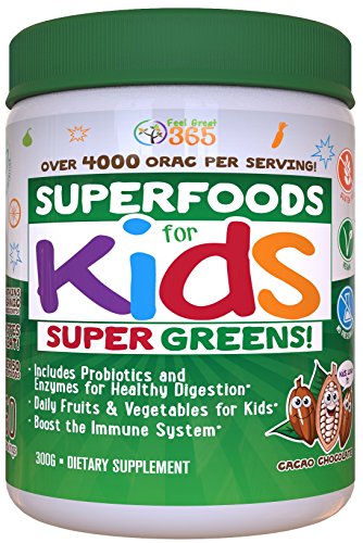BOOST YOUR KIDS If youre like most parents you simply cannot get your kids to eat enough fruits and vegetables Now you can take one serving of Superfood for KIDS and get them the nutrition they need to be in order to stay healthy With tons of berries broccoli spinach kale spirulina and dozens of other ingredients including probiotics digestive enzymes antioxidants vitamins and minerals this one green Superfood covers all the bases for a growing child